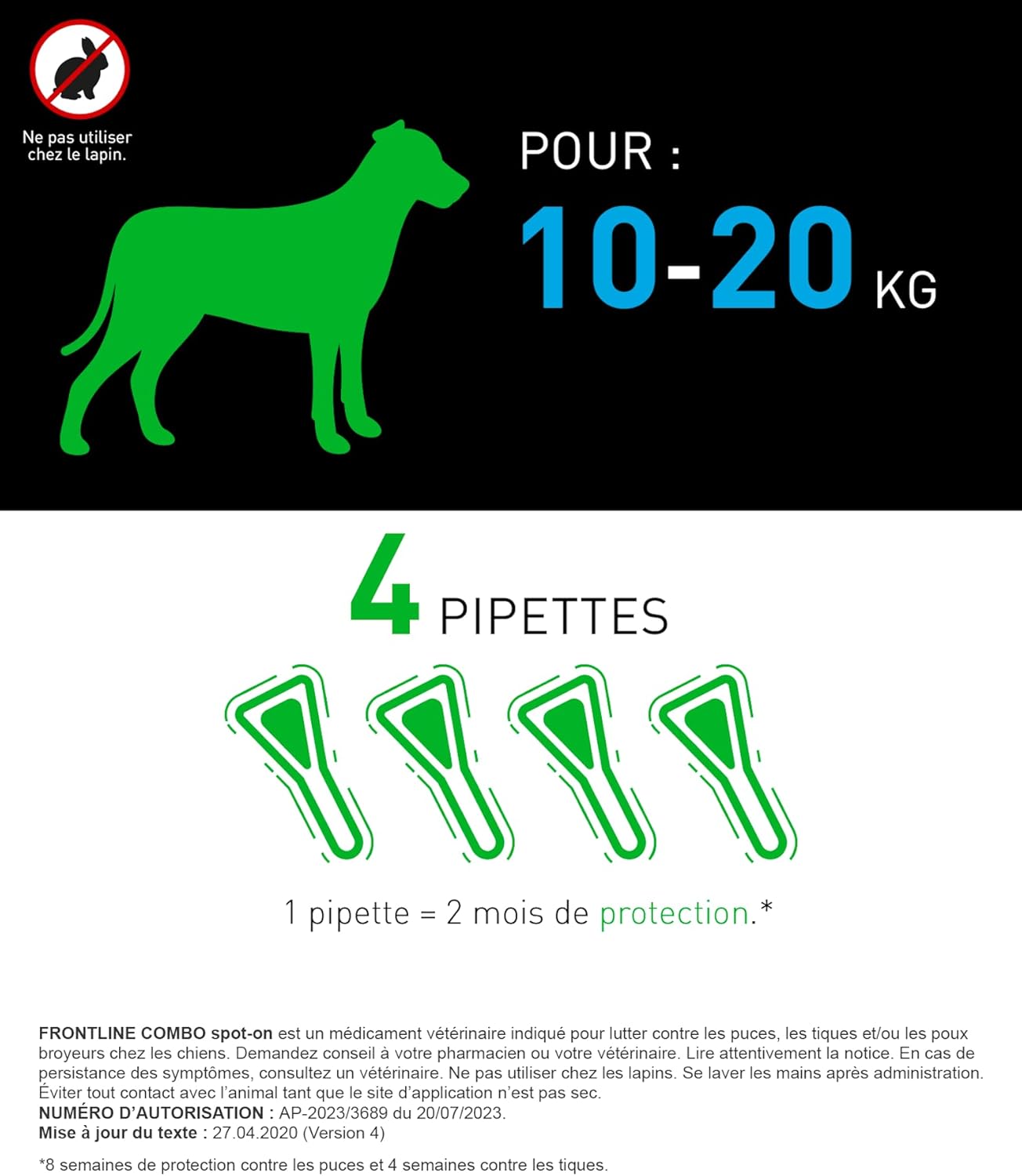 Tailles disponibles:Pour le chiens de petits tailles 2-10kg, pour les chiens de taille moyenne Frontline Combo 10-20Kg, pour les chiens grands Frontline Combo 20-40Kg et pour les chiens géants Frontline Combo +40Kg.
